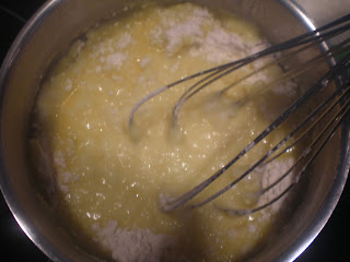 Ponemos al fuego el agua con la leche, la mantequilla y el azúcar y cuando empiece a hervir apartamos del fuego y añadimos la harina de golpe. Batimos bien y añadimos los huevos, mezclando hasta obtener una masa homogénea.