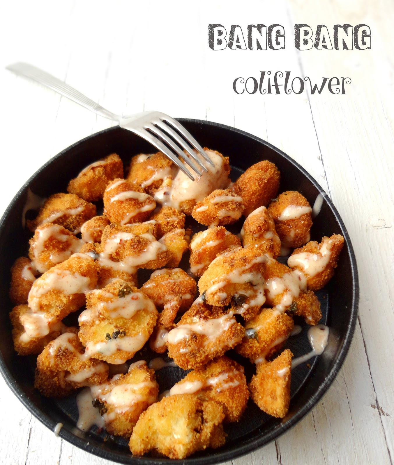 Esta salsa conocida como bang bang es muy conocida en la costa oeste de EEUU, donde en un principio se usaba para bañar unos deliciosos langostinos. Esta es la versión vegana que ha surgido desde entonces y que, al menos, ha conseguido que mi hijo pruebe la coliflor... Y eso ya son palabras mayores!