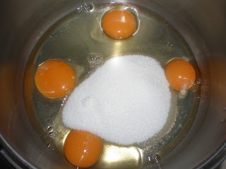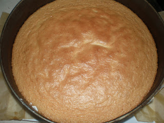 Para hacer el bizcocho batimos los huevos con el azúcar hasta que queden espumosos y añadimos la harina tamizada con la levadura mezclando con movimientos envolventes para que los huevos no se bajen. Vertemos en el molde engrasado y horneamos unos 20 minuos a 180ºC.